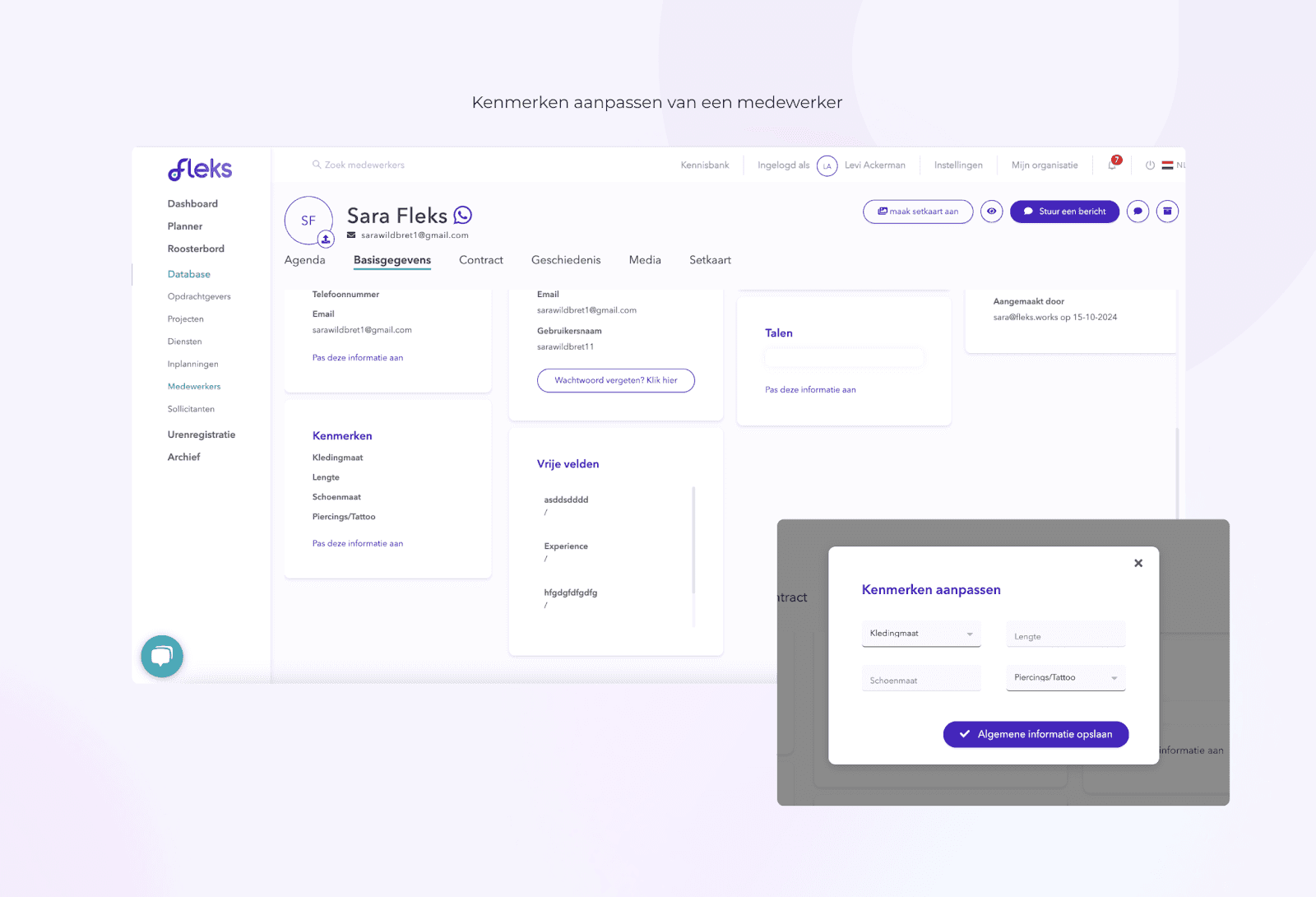 In the same pop-up, you can also fill in general information, characteristics, and other fields. This includes the employee's name, relevant characteristics such as height, and contact details.