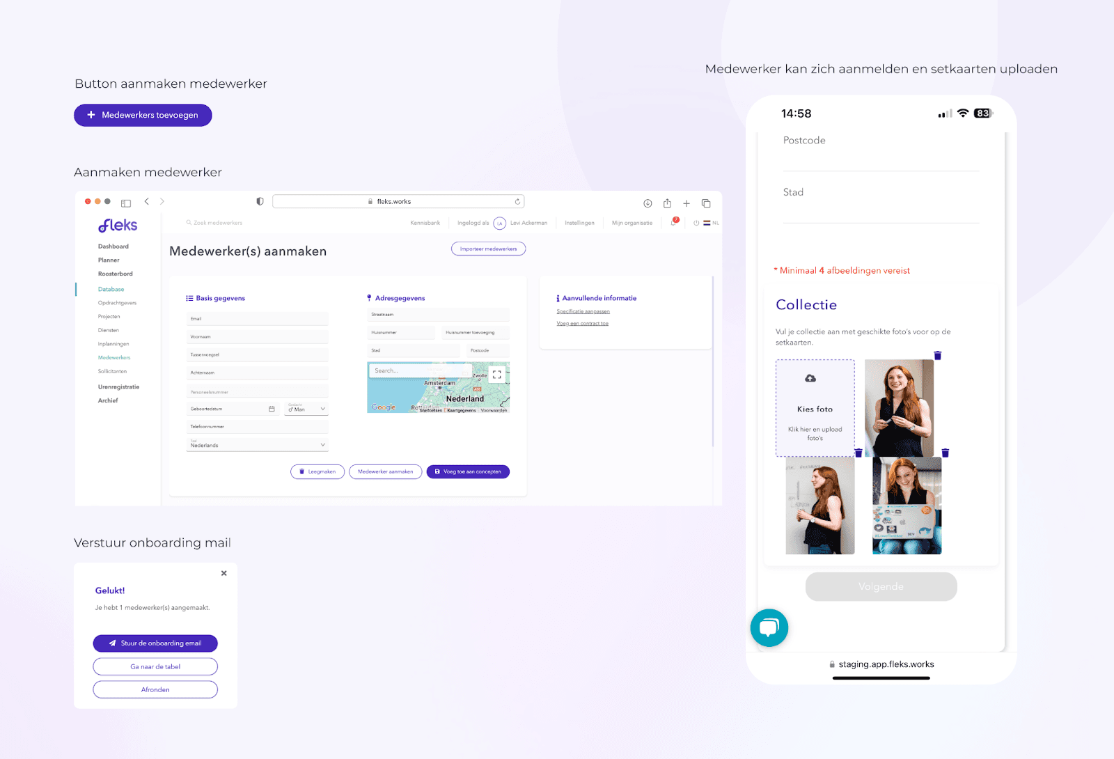 When you add a new employee to your Fleks account, the employee will receive an onboarding email. This email asks them to fill in their personal details and add professional photos to their profile. These photos can later be used to create a set card. This means you immediately have the right visual information at your fingertips.